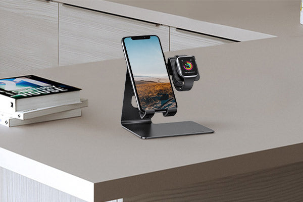- 【Exquisite Details Design】The use of phone holder and apple watch dock 2 in 1 can save your space. Convenient cable management to make the desktop clean and tidy. The hook width of the stand is 14mm, it can fit your phone with case.Supports Nightstand Mode, simply rest your Apple Watch horizontally and let the dock do the rest.